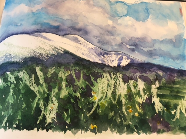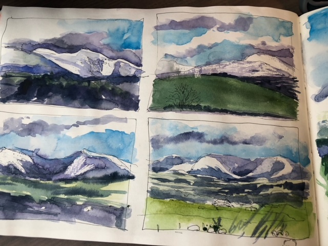 It’s a mixed blessing, I love the snow but always a worry if you are travelling. I was in Wales and needed to travel back to Devon by train the day the snow hit. Up until that point it was an only a dusting on the mountains. On my day of travel it was much thicker, fortunately the day after was the worst. Caught the beauty of the Welsh mountains in my sketchbook. I love using wax to resist the paint and leave the snowy mountains behind.